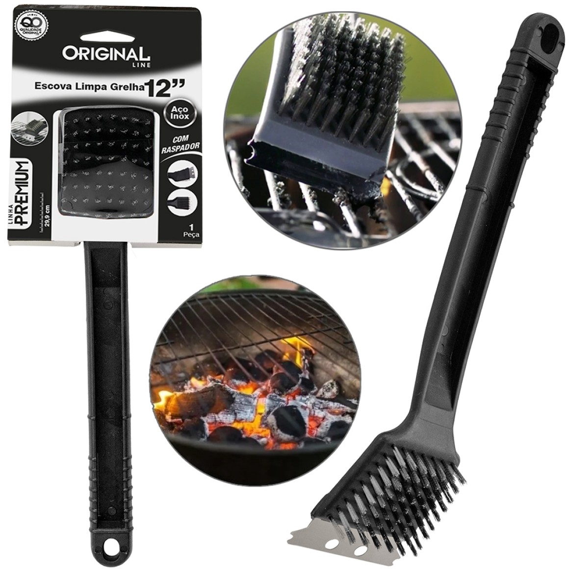 ESCOVA PARA GRELHA CHURRASQUEIRA COM CABO +RASPADOR PREMIUM 12"