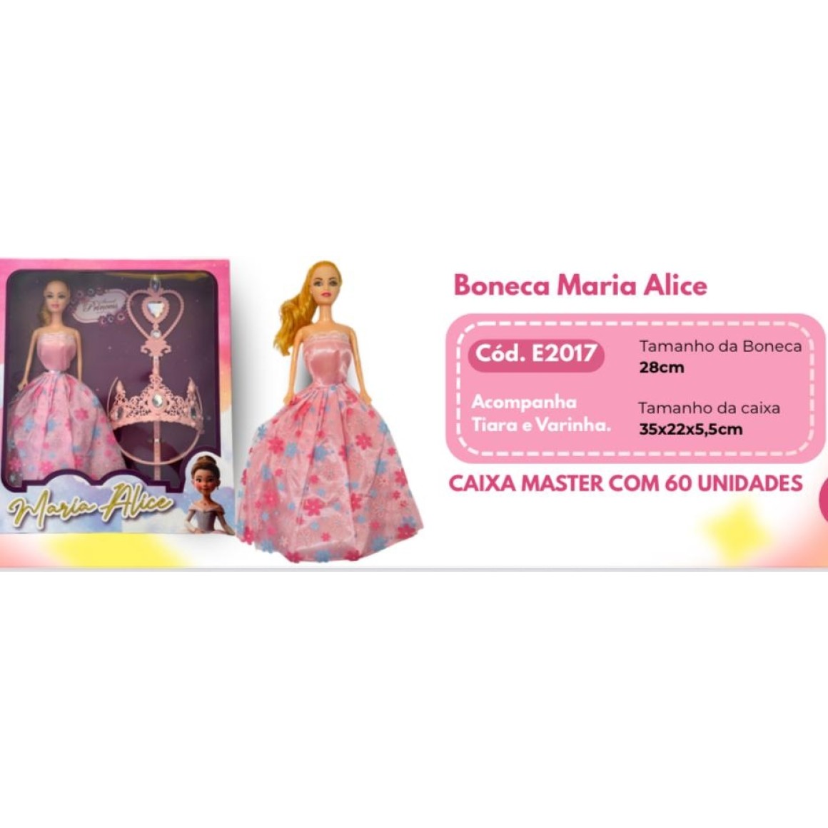 Tipo de produto: BONECA MARIA ALICE COM VESTIDO + TIARA E VARINHA MAGICA / CETRO